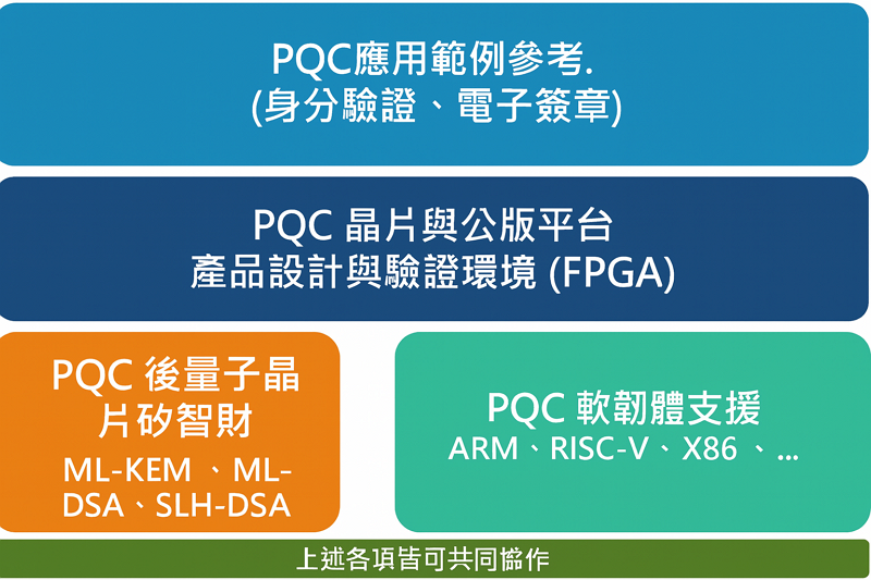 為強化本團隊開發之「PQC晶片與公版平台」的設計與支援,而不僅是技術的堆疊,本團隊研發步驟由晶片演算法→安全模組→平台驗證→國際合規,形成貫穿設計、驗證、量產與應用的完整生態鏈。透過金融、電信、半導體、國防等領域之合作落地案例,協助不同產業在既有系統上,平順、有效率地完成後量子資安遷移。