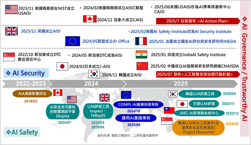 圖1 重要國家成立AI安全機構及發展AI技術評測現況(資料來源:網路公開資料;工研院產科國際所整理)