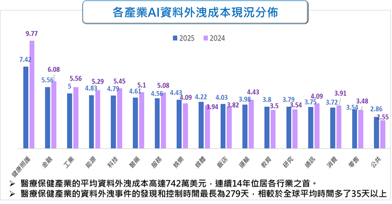 人工智慧技術發展關鍵是數據、算法、算力,其中數據是人工智慧的基本盤,因此AI Security與AI Safety的問題交集是資料。從IBM研究調查分析中發現一國AI檢測和升級成本高低與其資料外洩成本高低成正比,換句話說,一國在AI Security與AI Safety支出較多、監管罰款較高、AI檢測和升級成本較低等條件下,AI資料外洩狀況減少。比較2024-2025年為例,以國家來說,2025年美國平均AI資料外洩成本達到創紀錄的1,022萬美元,全球居冠,同時較2024年同期增加9%,部分原因是監管罰款及檢測和升級成本的增加。以產業類型而言,以醫療保健產業為全球資料外洩成本最高的產業類型,連續四年為各行業之首。通常攻擊者瞄準醫療保健行業的重點在於患者個人識別資訊(Personally Identifiable Information,PII),這些資訊可能用於身分仿冒、詐欺、金融犯罪等。如圖2所示。