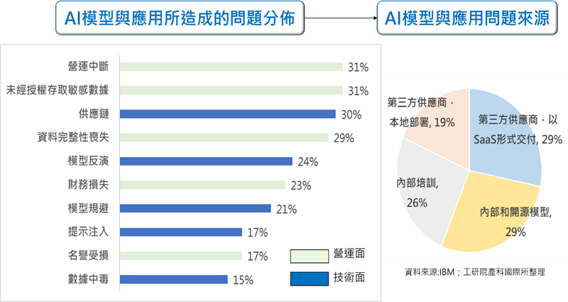 除了資料外洩問題之外,導入AI模型或應用所帶來的問題也日趨普遍,例如:營運中斷(31%)、影響供應鏈(30%)、資料完整性喪失(29%)、模型反演(Model Inversion)、模型規避(Model Evasion)等,追溯這些問題的來源多半是來自第三方提供AIaaS(AI-as-a-Service)的解決方案占29%,以及使用內部及開源模型占29%,如圖3所示。此反映出發展一般企業是需要的AI評測工具或系統來確保其所使用的AI模型與應用之安全性與可靠度。