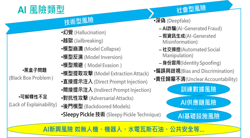 如從基礎模型(Foundation Models)、多模態模型(Multimodal AI)、世界模型(World Models)、行為模型(Behavior Model)、視覺模型(Visual Foundation Model),從強化學習(Reinforcement Learning)、自監督學習(Self-Supervised Learning)、聯邦學習(Federated learning)等,也持續在不同產業領域中持續衍生AI新模型與新技術突破,同時,這些AI模型依然也承襲了AI模型的技術型風險、社會型風險、訓練數據風險、供應鏈風險、基礎設施風險等。如圖4所示。