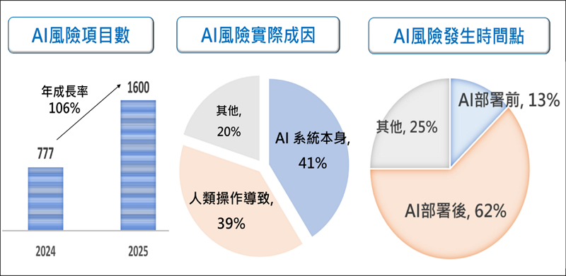 人工智慧技術發展日日皆有驚人的突破與創新,並快速進入各行各業,也創造出各式各樣的風險。因此,麻省理工學院(Massachusetts Institute of Technology,MIT)於2024年建立「AI風險資料庫」,根據本研究分析從2024年8月至2025年8月,同期成長106%目前累積有1600個AI風險項目數。同時AI風險來自於AI系統本身占41%、因人類操作而導致占39%,AI風險多發生在AI部署之後占62%,如圖6所示。