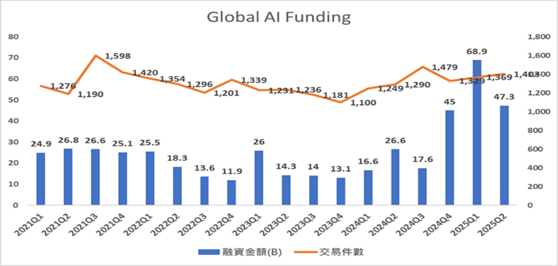 AI仍然全球創投的超級亮點,2025年第二季度,全球AI新創共獲得1,403筆融資,融資金額達473億美元。2025年融資總額(1,161億美元)已超過2024年全年總額(1,057億美元),如圖7所示。