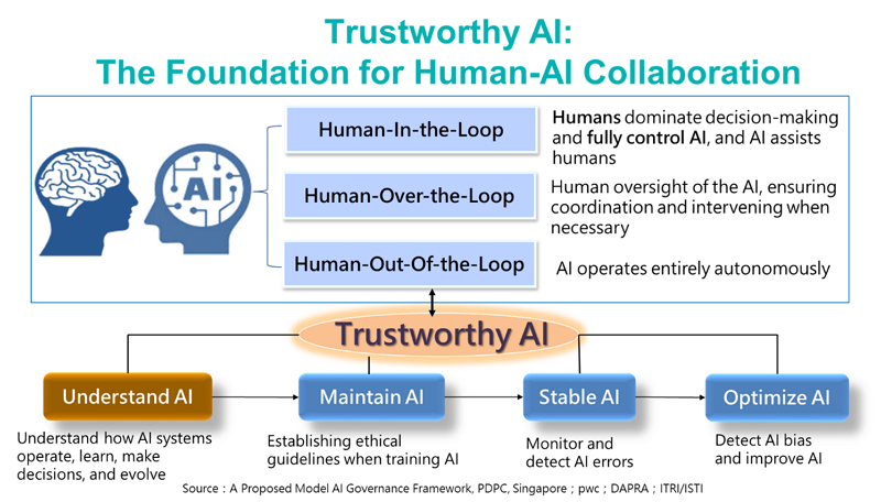 雖然目前AI發展方向與風險難以預測,全球也尚未有統一且明確的AI治理框架。但本文建議「以人為本」仍是AI技術發展的中心主軸,而機器人、無人機、自駕車、AI代理人等是全球產學研正在規劃致力投入的AI重點方向,因此需要重新思考如何做到「以人為中心」的AI人機協作機制,需遵守以Human-in-the-Loop及Human-Over-the-Loop來發展「可信任AI」技術。故特別分別說明:(1)Human-in-the-Loop中的AI角色是輔助人類決策。人類積極介入並監督AI,保留對AI完全的控制權,AI只需提供建議,AI不會主動去擔任決策者;(2)Human-Over-the-Loop:人類可調整AI執行決策。允許人類在AI執行演算法等任務時,也能調整參數等。因此,本文歸納出「可信任AI」四個發展策略途徑,以提供給有興趣投入者參考如下:(1)理解AI:理解決策型AI系統、生成式AI、基礎模型、開源模型、通用型AI等各種AI是如何運作、學習、決策和進化,並能掌握各種不同AI系統的因果關係及所有參與者的責任歸屬;(2)維護AI:發展各種AI系統、平台、模型等都要能做到可預測性、可重複性,同時能追溯訓練AI的數據其假設盲點及AI模型在某些條件下會失效或失敗,以採取適當的AI系統措施;(3)穩定AI:倘若AI發展任何問題或危害時,能夠適當採取糾正或調整措施,甚至能妥善關閉AI系統,並能辨識有危害AI系統或影響安全之不良設計、駭客攻擊、侵犯隱私等來源與問題;(4)優化AI:能找出AI模型或演算法中的缺陷與訓練數據中的偏差或偏誤等,進而能驗證AI可預測、改進模型、優化決策過程、從中獲得新 見解等。