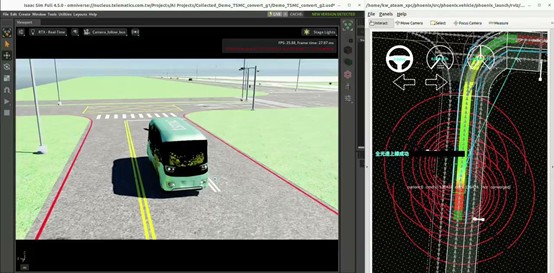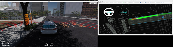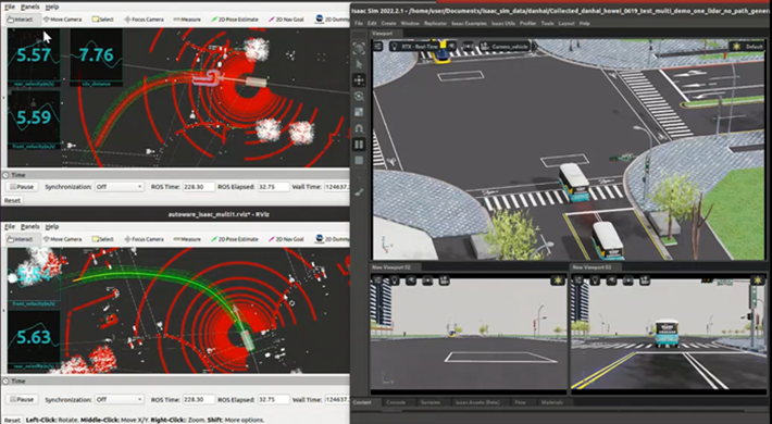 虛擬場景的建置工作由圖資團隊負責。團隊利用測繪車拍攝高精地圖與3DMAX虛擬場景,用以建立完整的Omniverse測試環境,同時打造虛擬車輛模型進行測試。自駕團隊則負責虛擬車輛的動態設定、感測器位置驗證,並開發控制、決策規劃與控制模組,最後進行靜態與動態行駛測試。