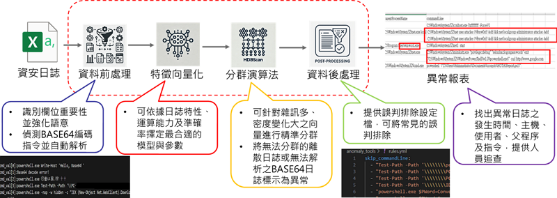為協助企業導入端點日誌分析防護機制,並有效降低其技術門檻,本院研發出一套「AI端點日誌異常分析與威脅偵測模型」,此模型可依照企業實際需求,客製化端點日誌的資料處理與分析流程,並無縫整合企業日常資安維運作業,達成資安防護能力的無痛升級。「AI端點日誌異常分析與威脅偵測模型」的整體分析流程共劃分為「資料前處理」、「特徵向量化」、「分群演算法」及「資料後處理」等四個階段,詳見圖1所示。