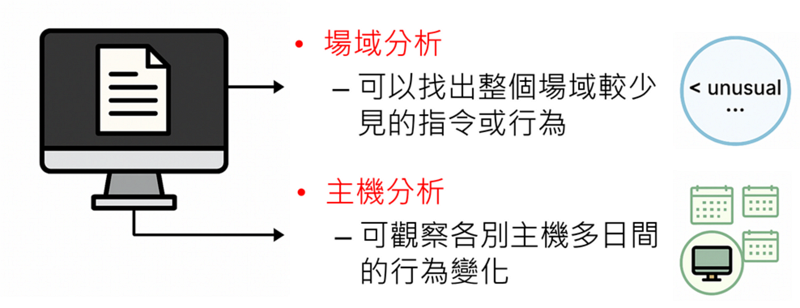 宏觀場域分析可先觀察整體端點環境的異常分布,將高頻但無害的「背景雜訊」過濾掉,避免單純因為少數不尋常行為就觸發警報。接著再透過微觀主機分析,深入檢視特定主機或帳號的行為脈絡,確認異常是否真正具備攻擊特徵。這種層層篩檢的方式,有助於降低誤報率,讓資安團隊聚焦於真正高風險的事件。