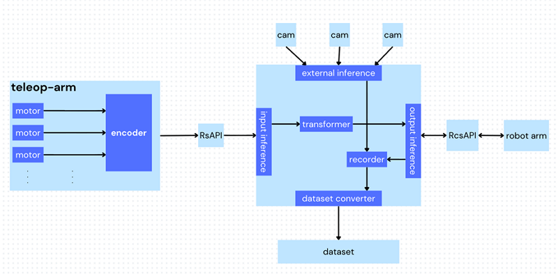 本架構分四區塊討論,輸入界面、輸出界面、外部輸入、遠端遙控中介層,本架構主要目的在模仿學習與機器人基礎模型發展使用,透過此架構生成所需用之資料集。